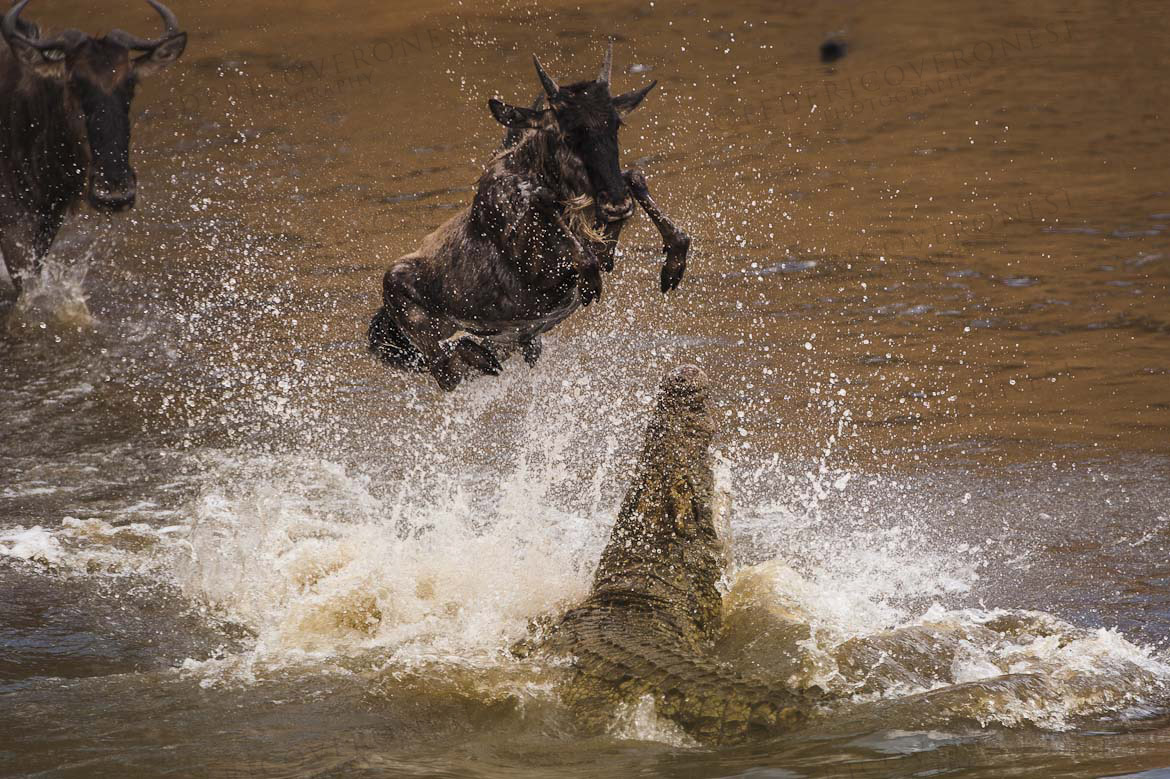 Nile Crocodile attacking Wildebeest calf during Mara river great migration crossing. MASAI MARA, KENYA